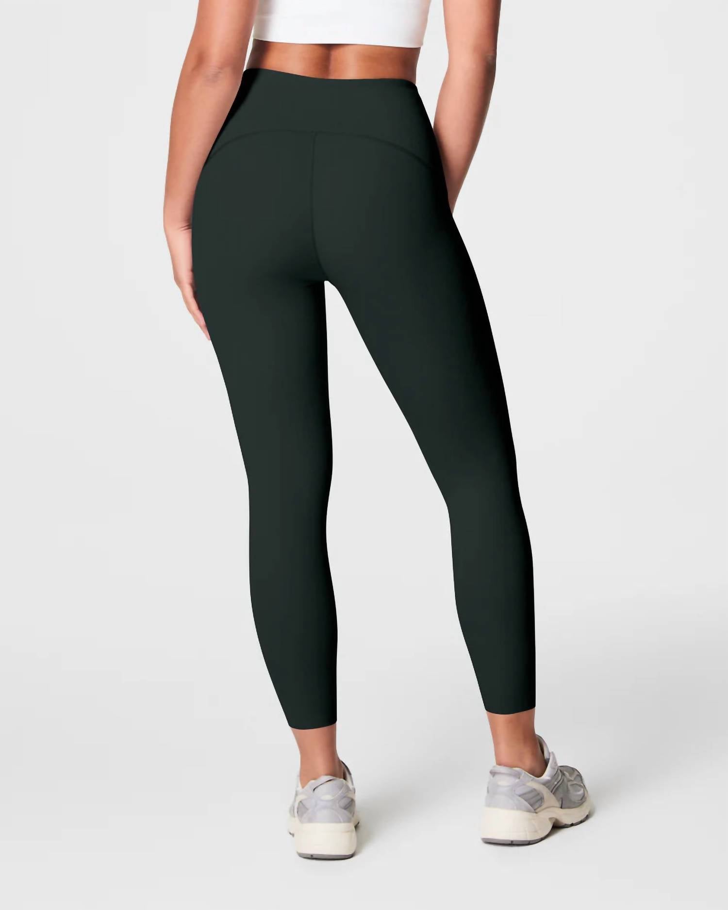 Introducing the Booty Boost Perfect Pocket Active 7/8 Leggings by Spanx, an essential athletic wear piece for women in the must-have Essex Green color. These full-length leggings offer a high-rise waist with a slim fit and pull-on closure, constructed from sculpting performance fabric to deliver unbeatable support. Designed with super-discreet drop-in pockets, the leggings feature a 25" inseam, breathable and sweat-wicking material, and a contoured waistband to give you a flattering silhouette. Perfect for summer athleisure, these leggings combine style and comfort effortlessly.