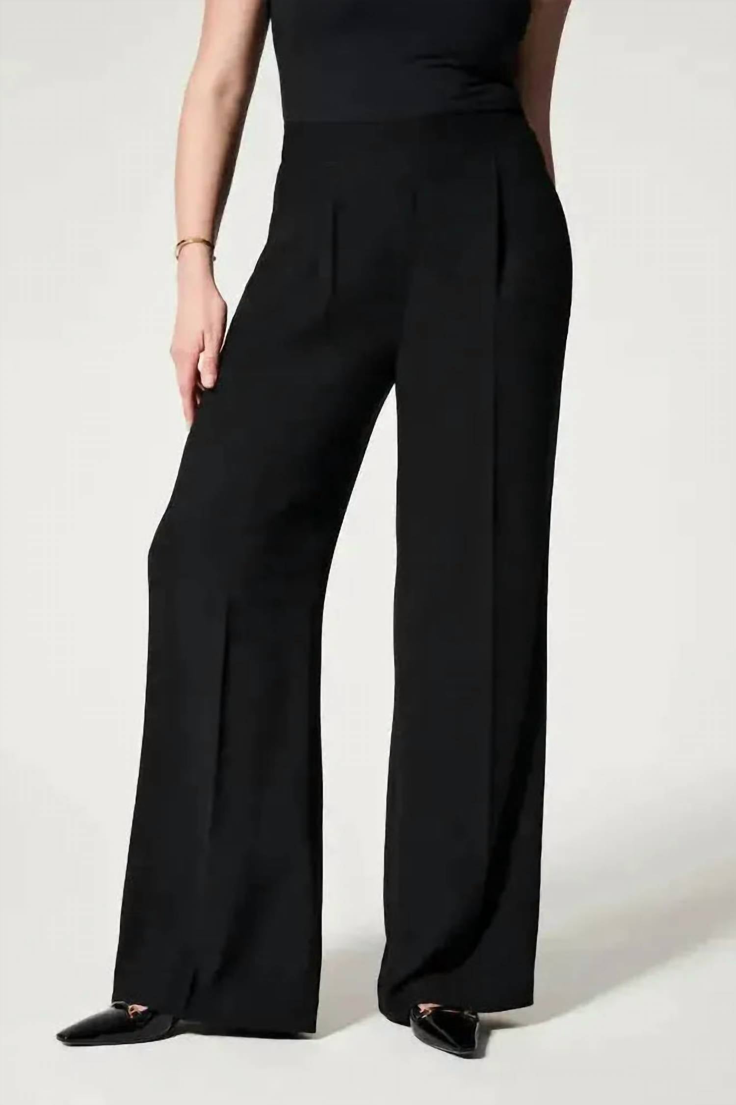 Introducing the Carefree Crepe Pleated Trouser by Spanx, a chic addition to any wardrobe designed for both style and comfort. These black, solid trousers feature a high-rise, relaxed fit with a wide-leg style, providing an effortlessly flattering silhouette. Crafted from lightweight crepe material, they boast a pull-on closure, eliminating the need for complicated fastening. Ideal for the spring season and workwear occasions, these trousers seamlessly blend comfort with sophistication.