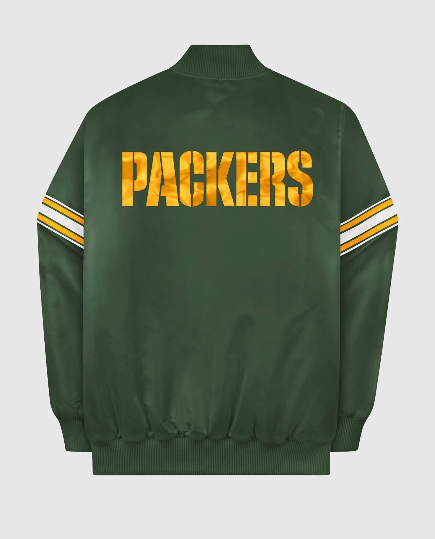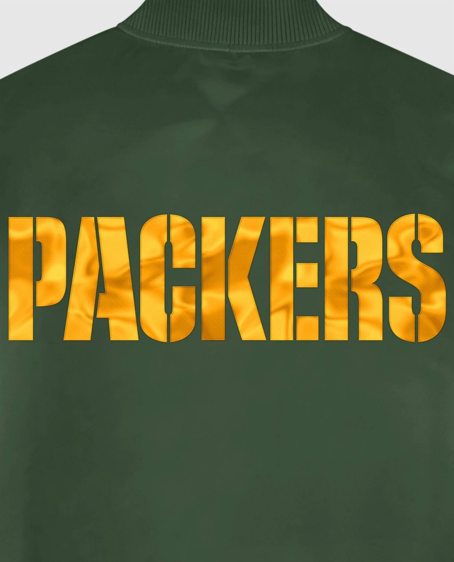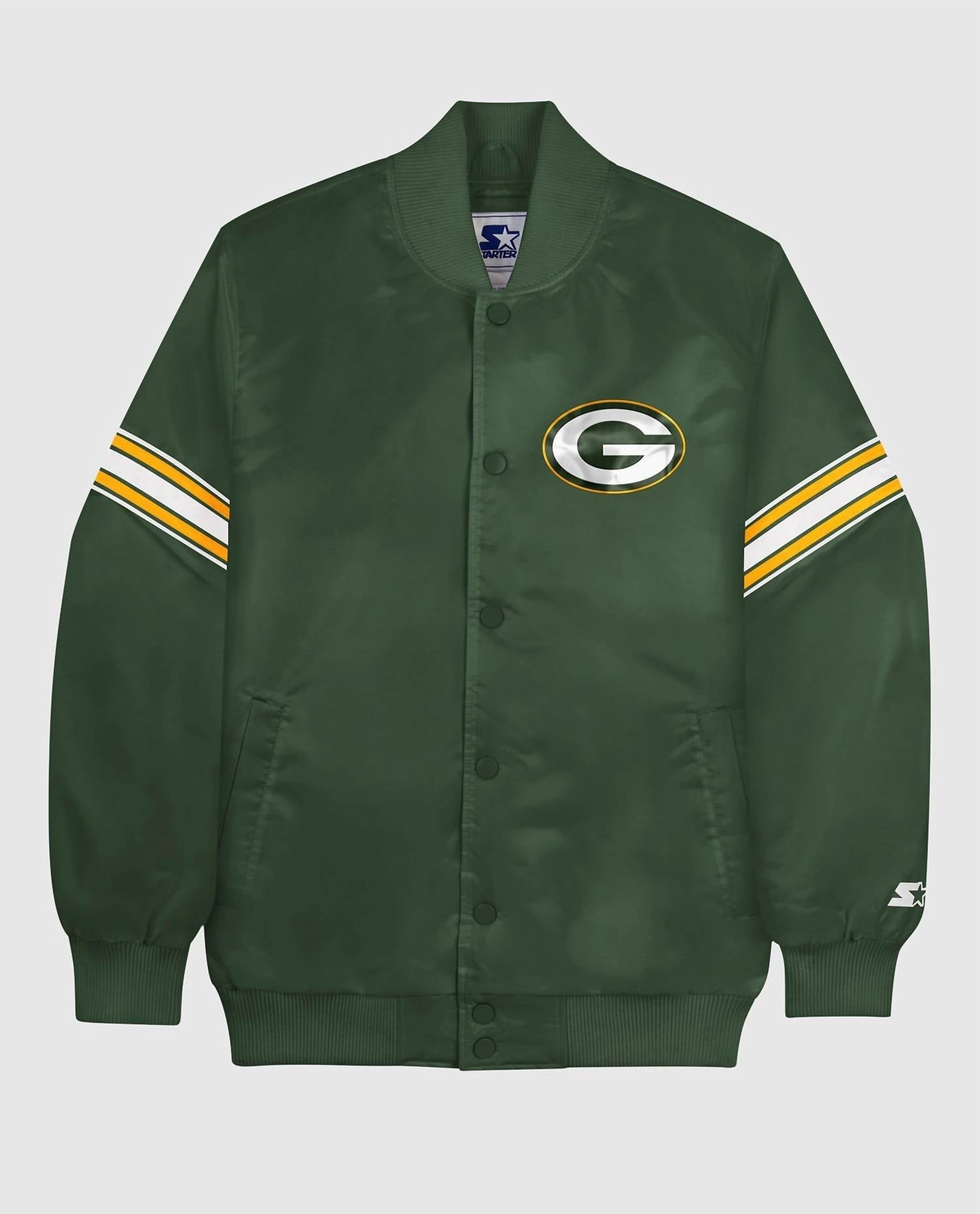 Show your team spirit with the Men's Green Bay Packers Varsity Jacket by Starter, a striking fusion of style and allegiance. Tailored with long sleeves, this varsity jacket features a crewneck design and a snap closure for secure wear. Crafted from 100% polyester box twill, it proudly displays the team logo applique patch on the chest, a wordmark on the back, and a conference logo on the sleeve. Ideal for any Packers fan, this jacket is both fashionable and functional.