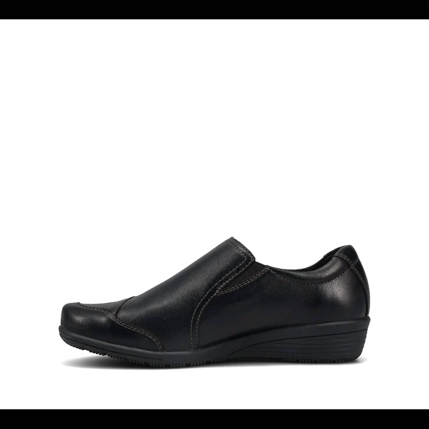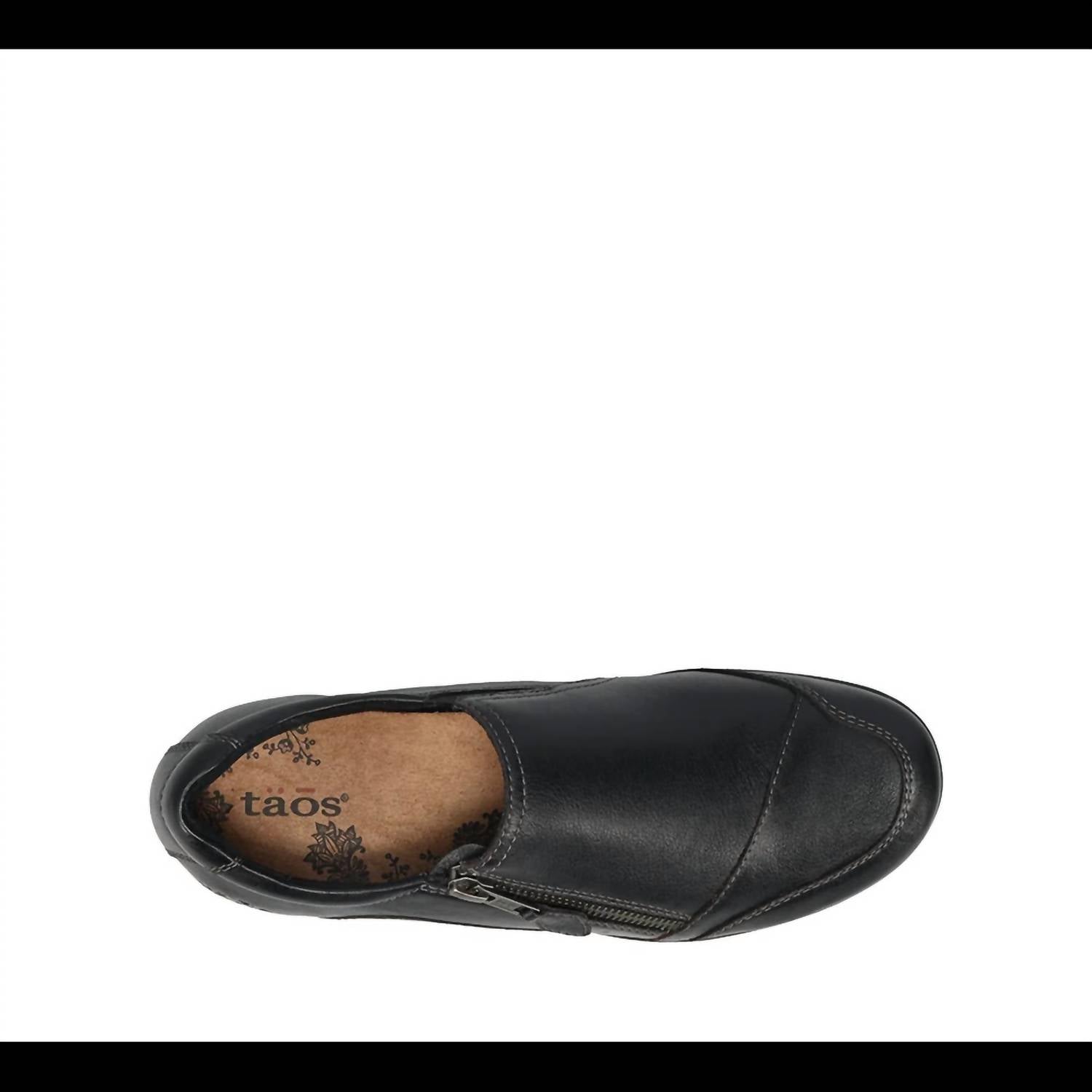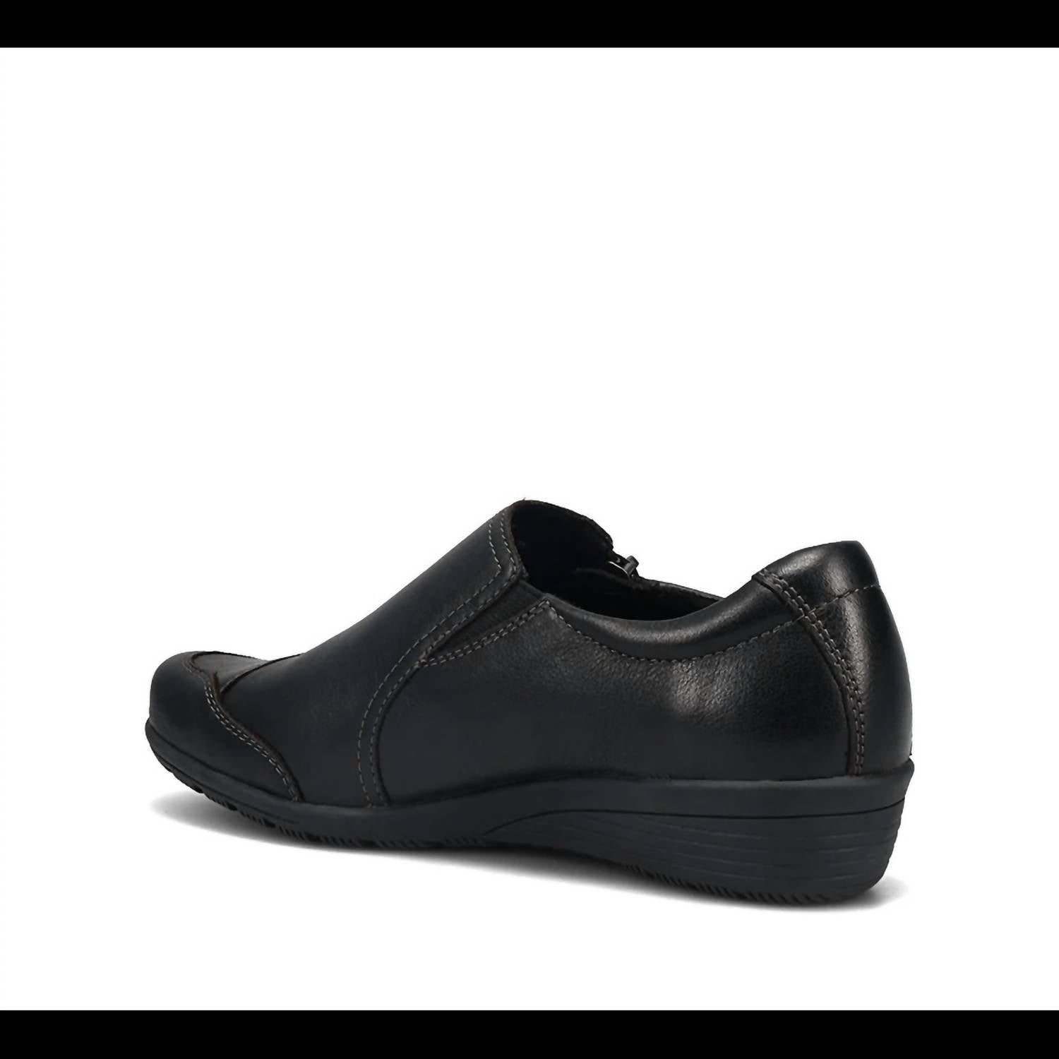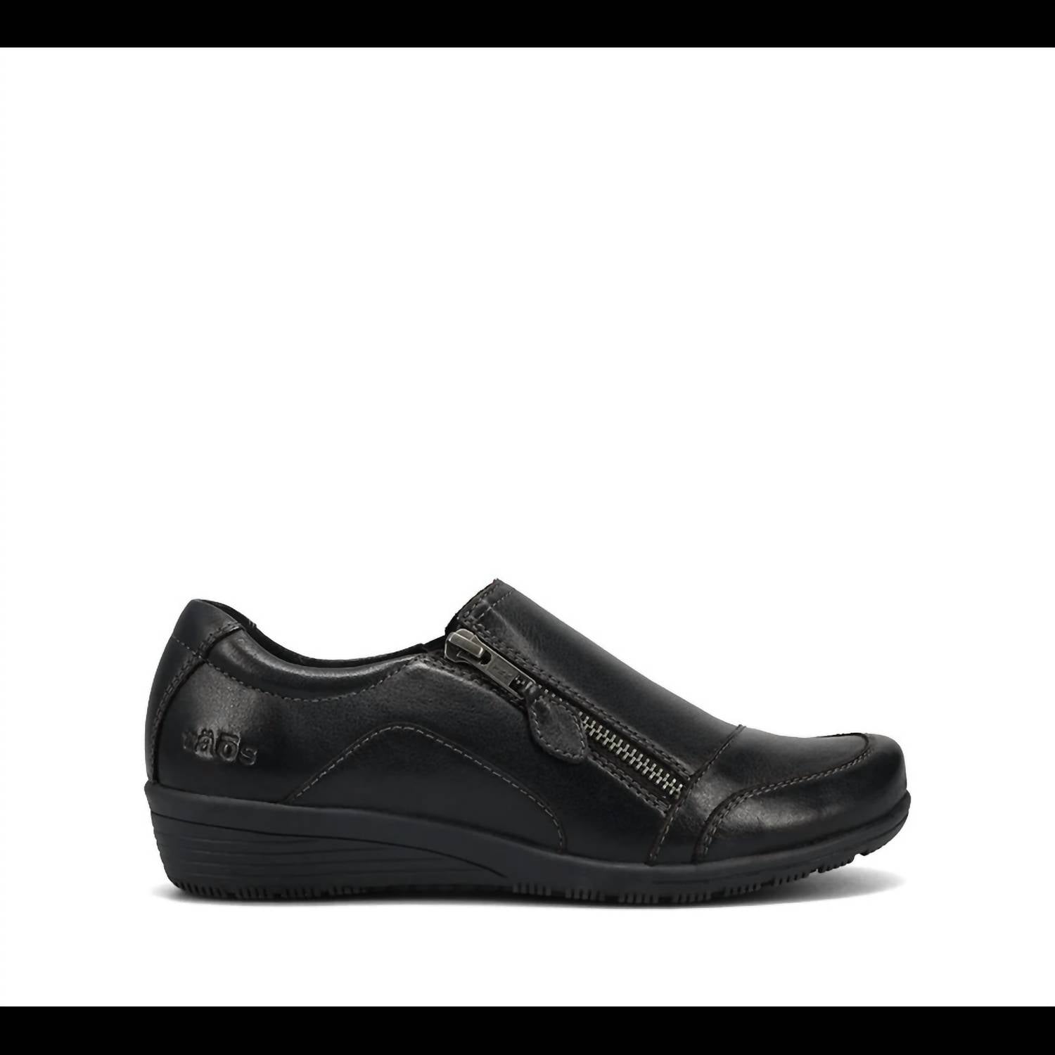 Meet the Women's Character Side-zip Loafer by Taos, an epitome of quiet luxury in versatile black. This loafer, featuring a convenient zipper closure, provides essential arch and metatarsal support while its unique Curves & Pods® removable footbed promises all-day comfort. The leather upper pairs elegantly with a premium microfiber lining and a leather footbed lining that includes an antimicrobial shield for added hygiene. Care is effortless, requiring just a buff with leather cleaner or polish, and a wipe-off with a dry cloth. With a flat heel height of 1 inch and weighing just 10.4 oz per shoe, it's both light and supportive for everyday wear.