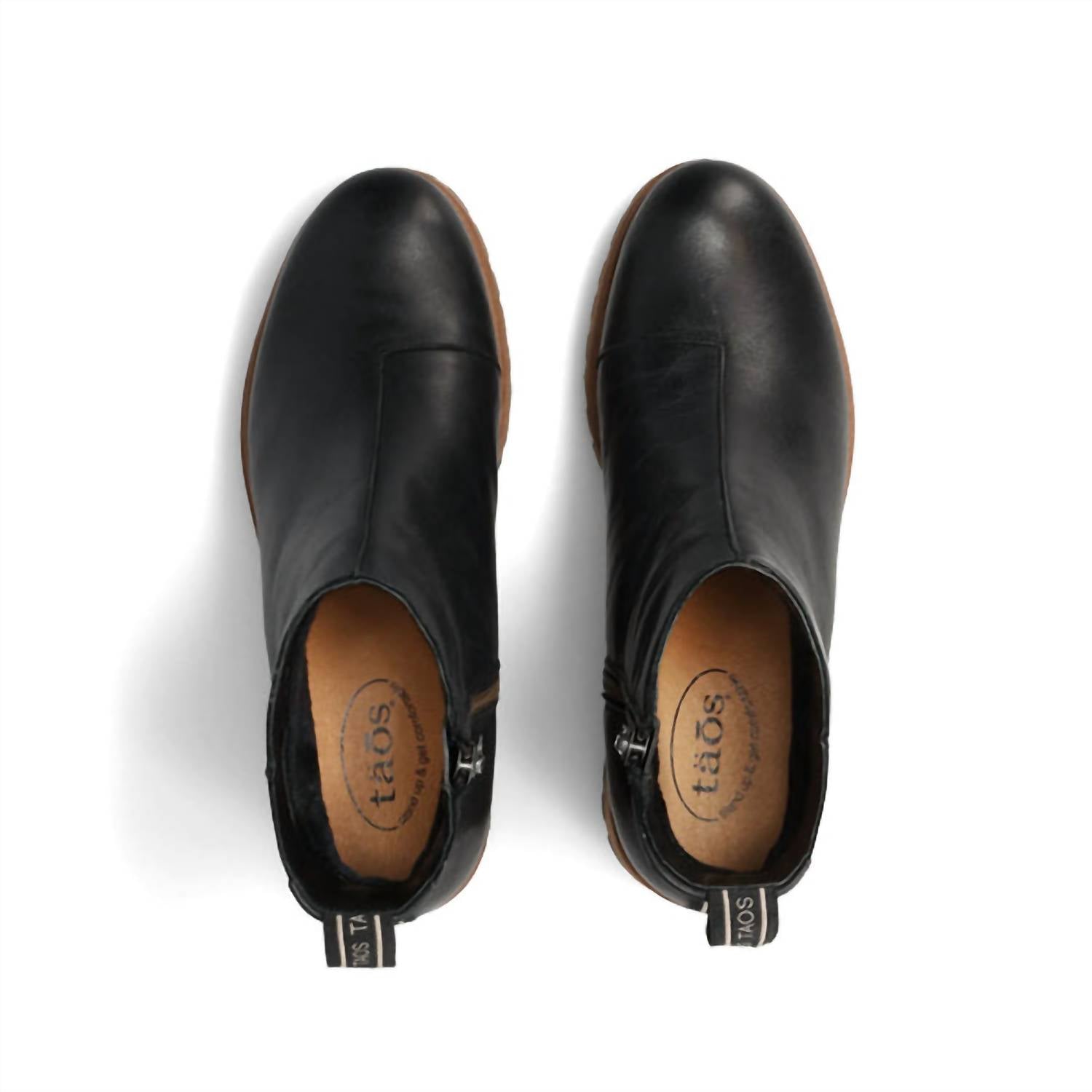 Step out in style with the Women's Downtown Boot from Taos, crafted from smooth European leather in a sleek black finish. This ankle boot features an inside zipper closure, making it easy to slip on and off, while a faux fur leather lining ensures added comfort. The lightweight cork and polyurethane midsole provide just the right amount of platform for a subtle height boost, complemented by a durable lug rubber outsole. Ideal for spring streetwear or a New Year's Eve dinner party, this boot offers a chic round toe and low chunky heel, perfect for any occasion.