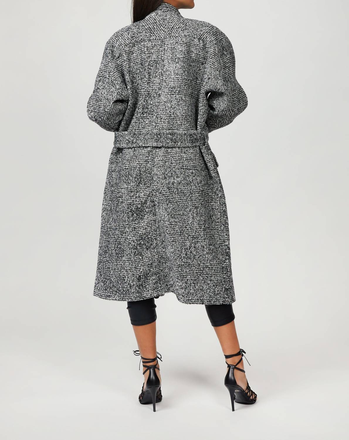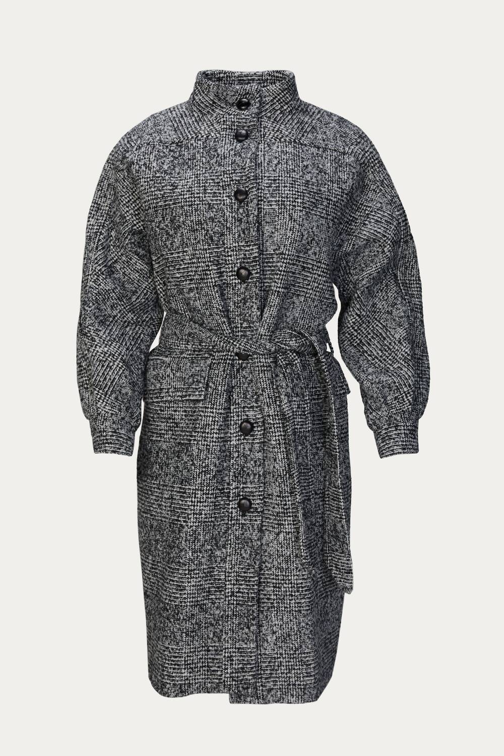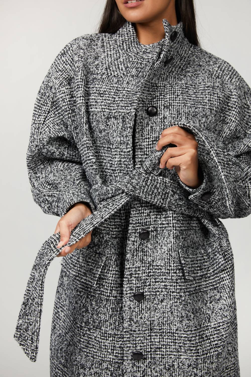 The perfect trench coat that you can throw over any outfit.Look to The Kooples for a timeless outwear-edit, which includes this checked black coat. Made from a wool-blend, it's cut to a relaxed style with a refined high neck and figure-defining self-tie waist belt. Drape yours over everything from daytime tailoring to after-dark dresses.Fabrication: Exterior - 34% Wool, 33% Acrylic, 33% Polyester; Lining - 51% Acetate, 49% Viscose; Pocket Lining - 100% PolyesterCare: Dry cleanFrench SizingCheyenne is wearing size FR32