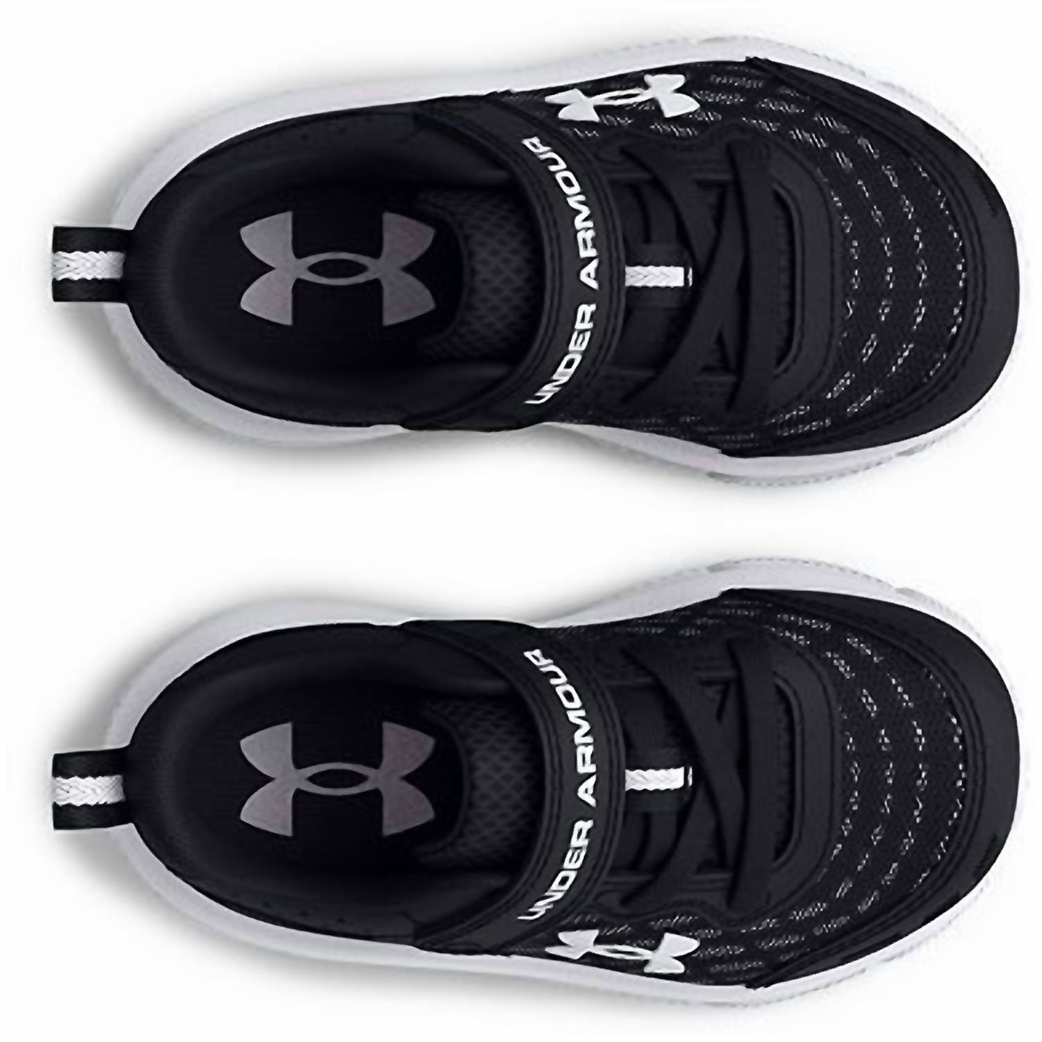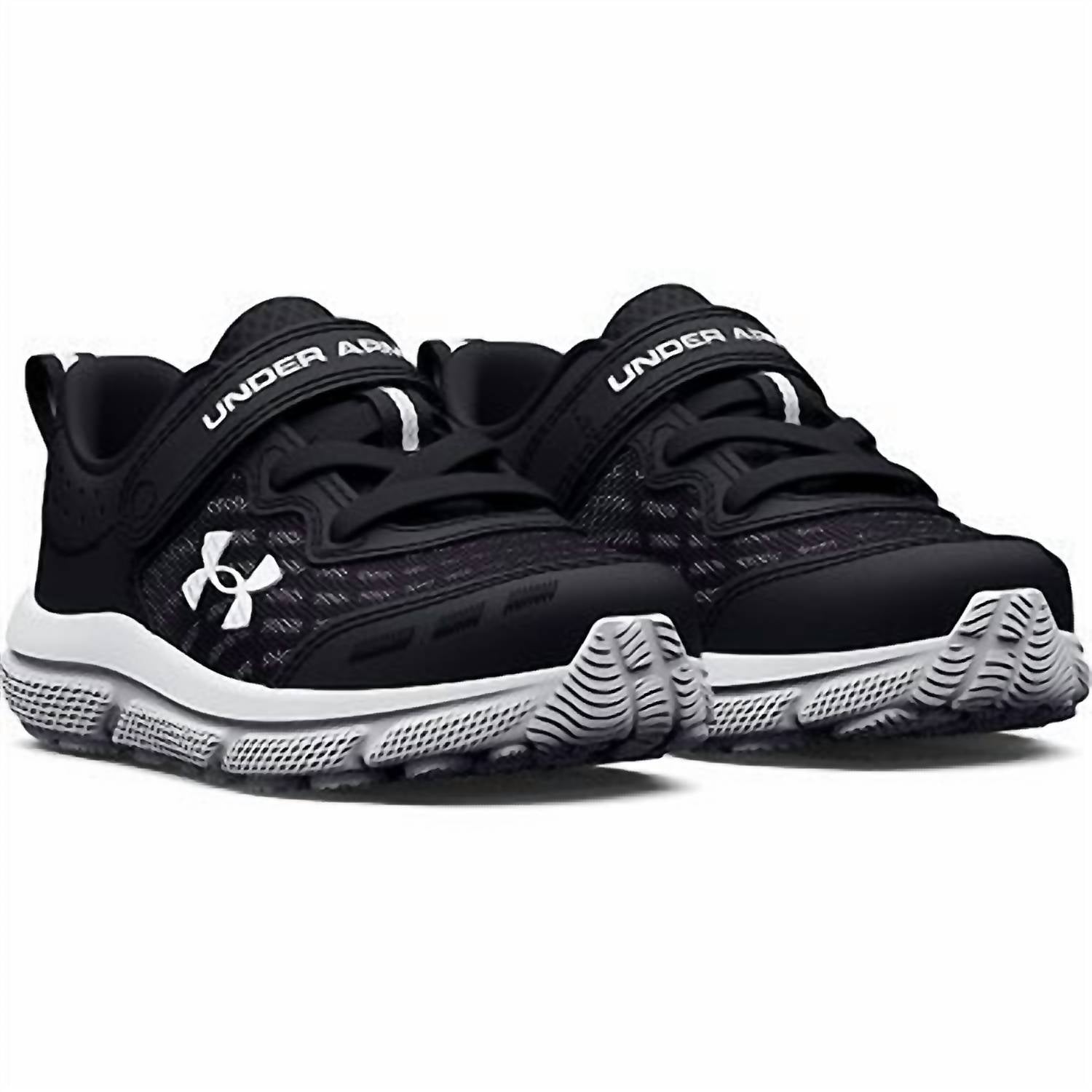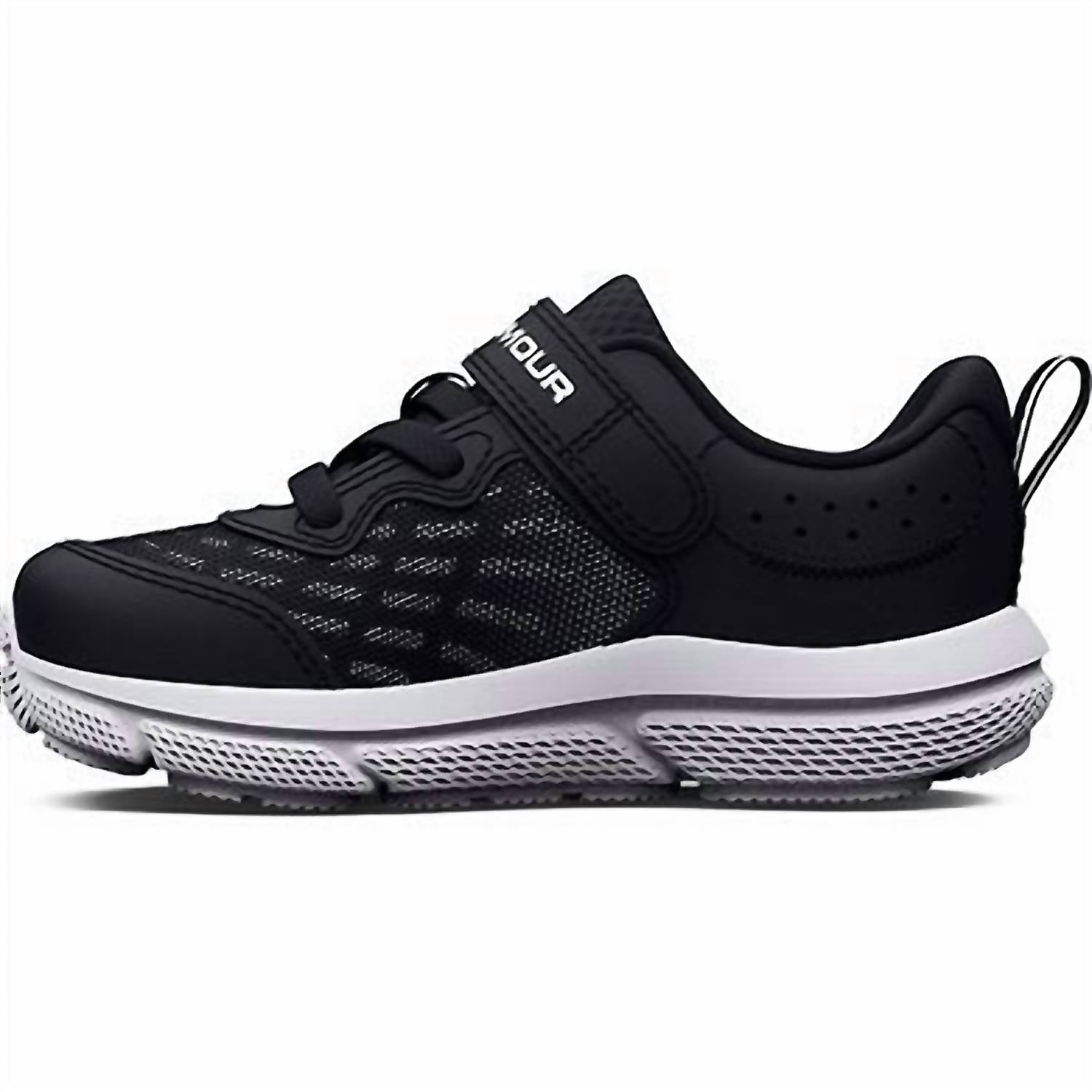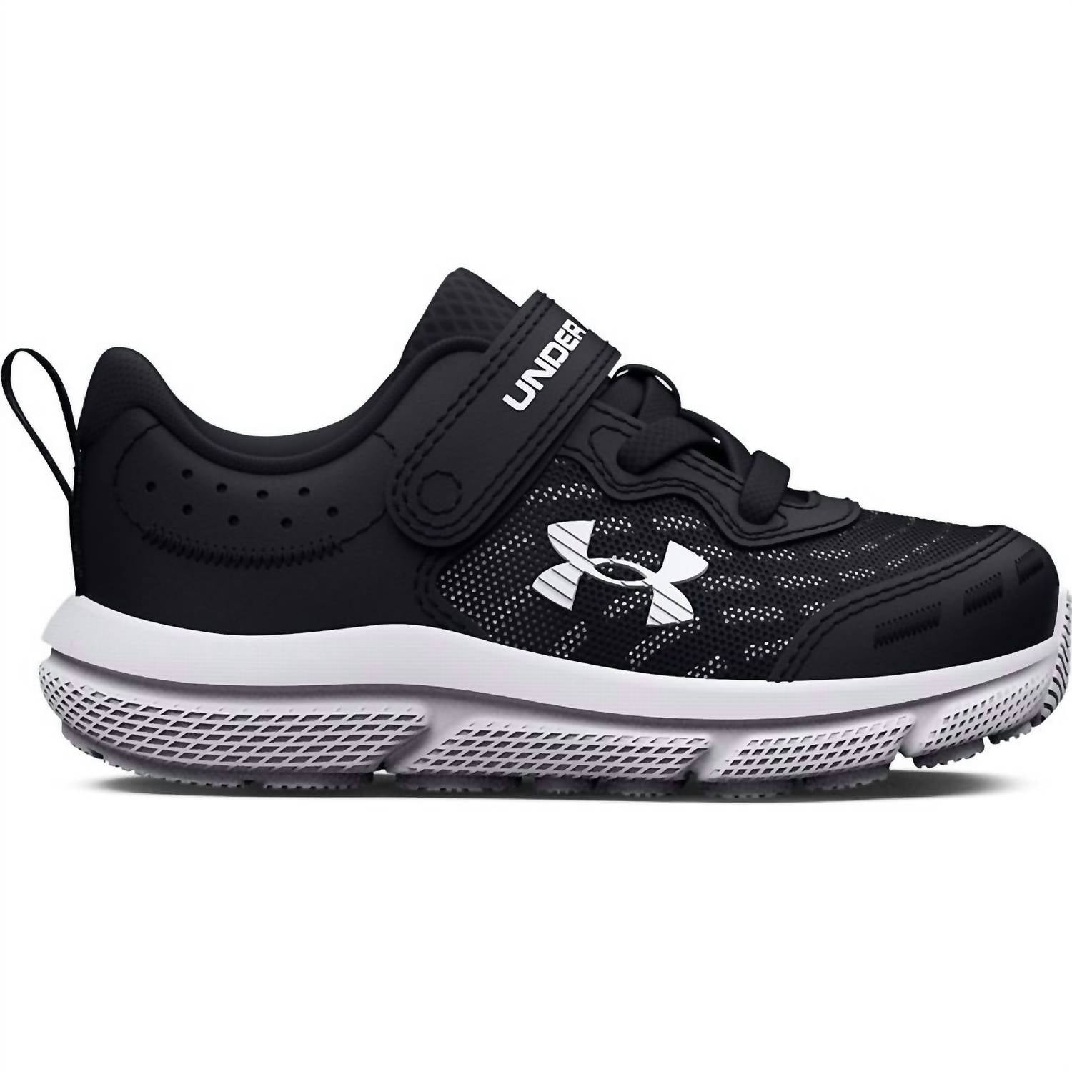 Introducing the Kid's Assert 10 AC Running Shoes by Under Armour, crafted to support your toddler's active lifestyle. These sneakers feature a lightweight, breathable mesh upper with synthetic overlays for enhanced durability and support, complemented by a one-piece EVA midsole for cushioned landings. Closure: Lace-up with a convenient hook-and-loop strap. Care: Spot clean. Imported from superior craftsmanship, these round-toe sneakers are perfect for fitness and workout occasions in trendy black and white.