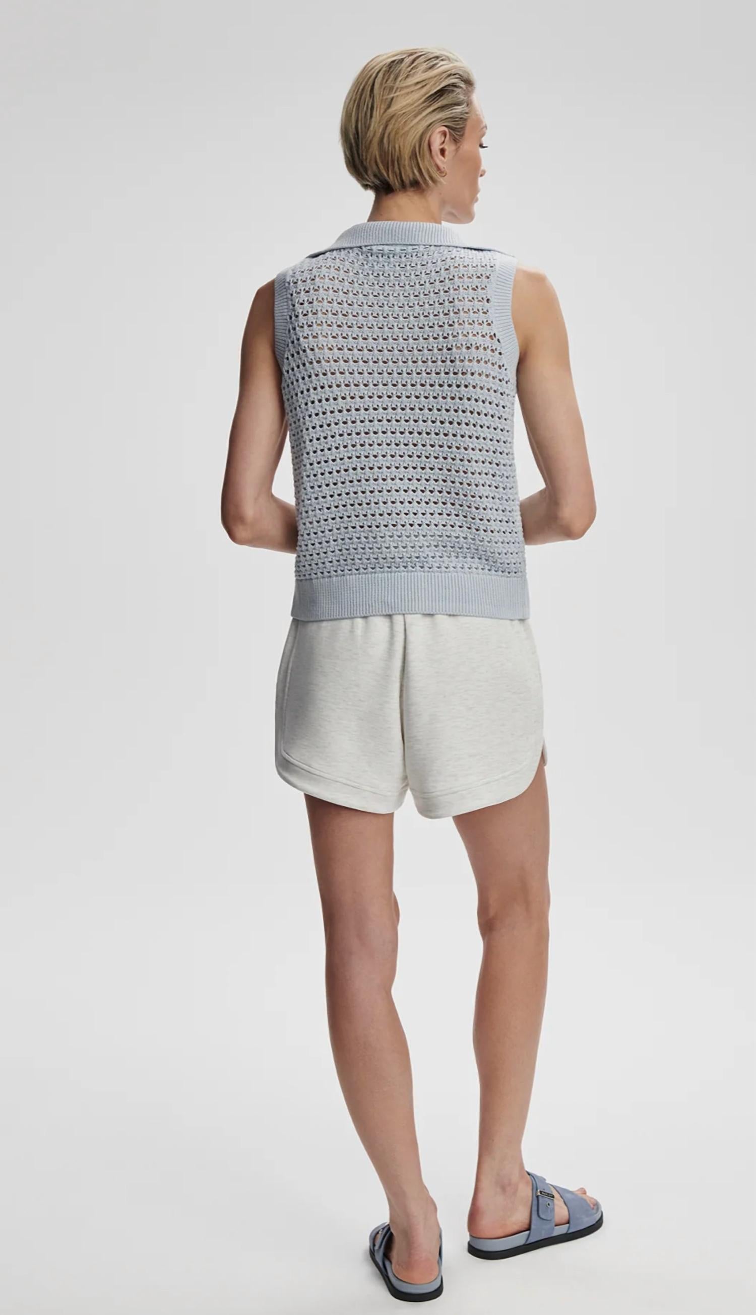 The Bains Half Zip Tank by Varley brings minimalist elegance with its solid Plein Blue shade and mockneck design. This sleeveless top, crafted from 100% cotton, features a slightly cropped hem perfect for pairing with high-waisted pants and shorts. Closure is secured with a zip, and it offers ease of care with machine washing. Designed for the modern woman, it is ideal for spring vacations or Easter occasions. Model is 5'9" and wearing a size S, with a front length of 19.7".