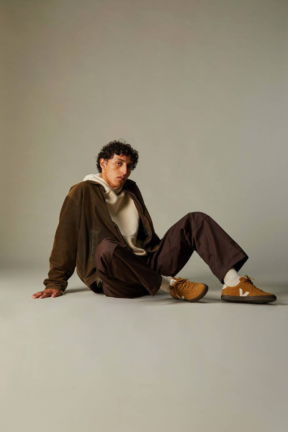 Step into summer with the Men's Volleyball Suede Sneakers by VEJA, crafted with care and sustainability in mind. These Natural Eagle sneakers feature a round toe and monochrome trend, perfect for game day. The suede used is sourced from farms in the Rio Grande do Sul region and tanned in Brazil, adhering to strict environmental standards and coated with PFC-free water-repellent oils to keep your feet dry in light rain. Processed with dyes that meet regulations, these sneakers embody VEJA's commitment to responsible production.
