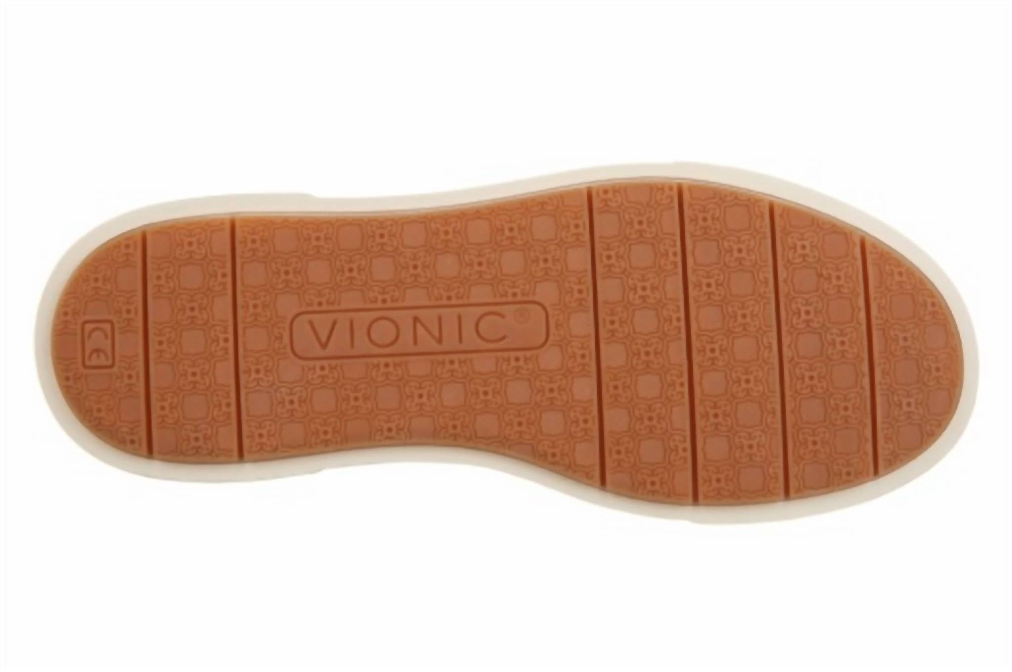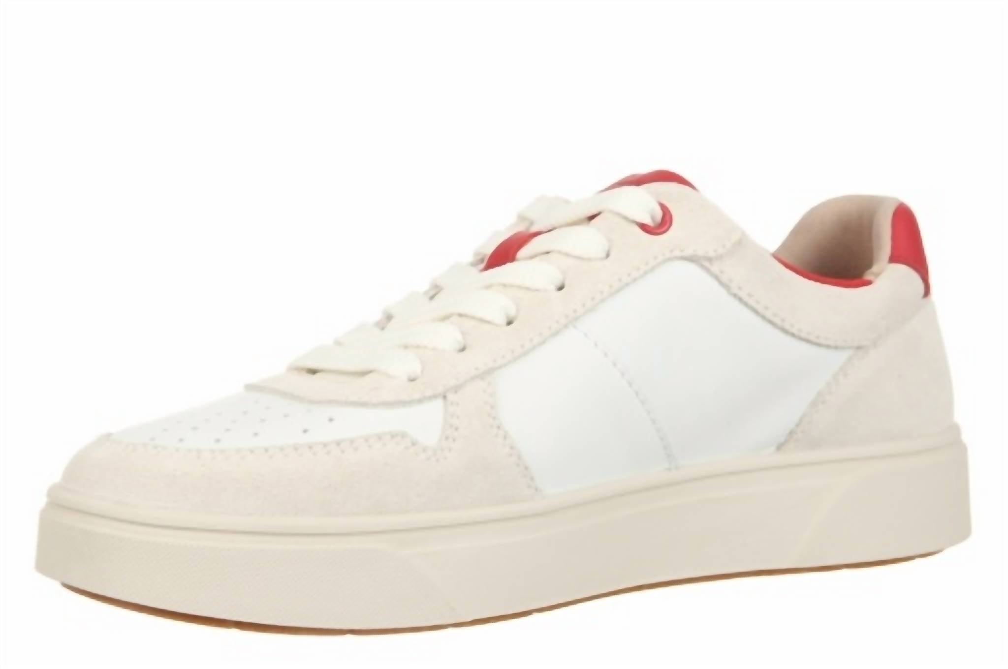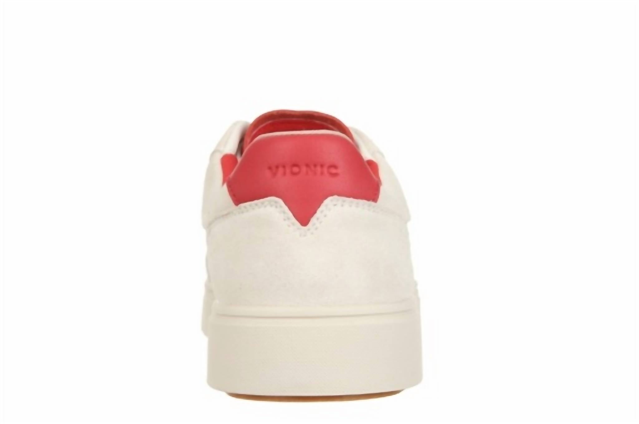 Discover the Women's Kimmie Court Sneaker by VIONIC, a stylish addition for athleisure and travel in trendy cream and red hues. Designed with an adjustable fit, these sneakers feature a round toe and a secure lace closure. The shoe boasts a luxurious leather upper and a removable insole for customizable comfort. Constructed with a durable rubber outsole, this perfect spring footwear ensures both style and practicality.