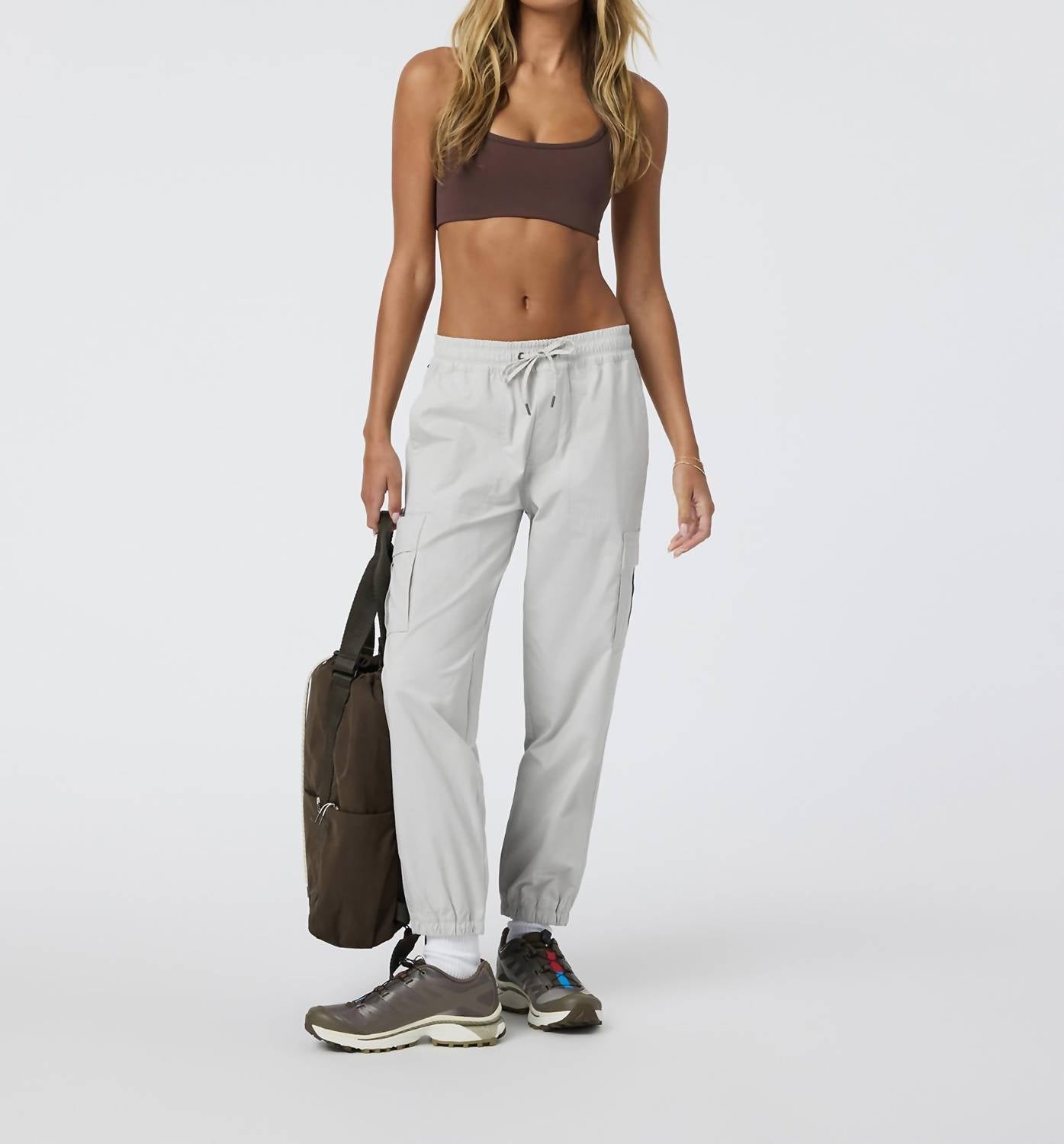 Introducing the Birch Jogger by Vuori in a chic Silver Cloud hue, a perfect choice for athleisure enthusiasts. These track pants are crafted from a Schoeller® Dynamic performance woven fabric, consisting of 71% Polyamide, 26% Cotton, and 3% Elastane, offering water repellent and abrasion-resistant benefits. Designed with a high rise and relaxed fit, they feature a pull-on closure and an elastic waistband with a drawcord, delivering comfort and style for any active occasion. With a convenient 26.5" inseam and machine washable care instructions, these joggers are both practical and versatile.
