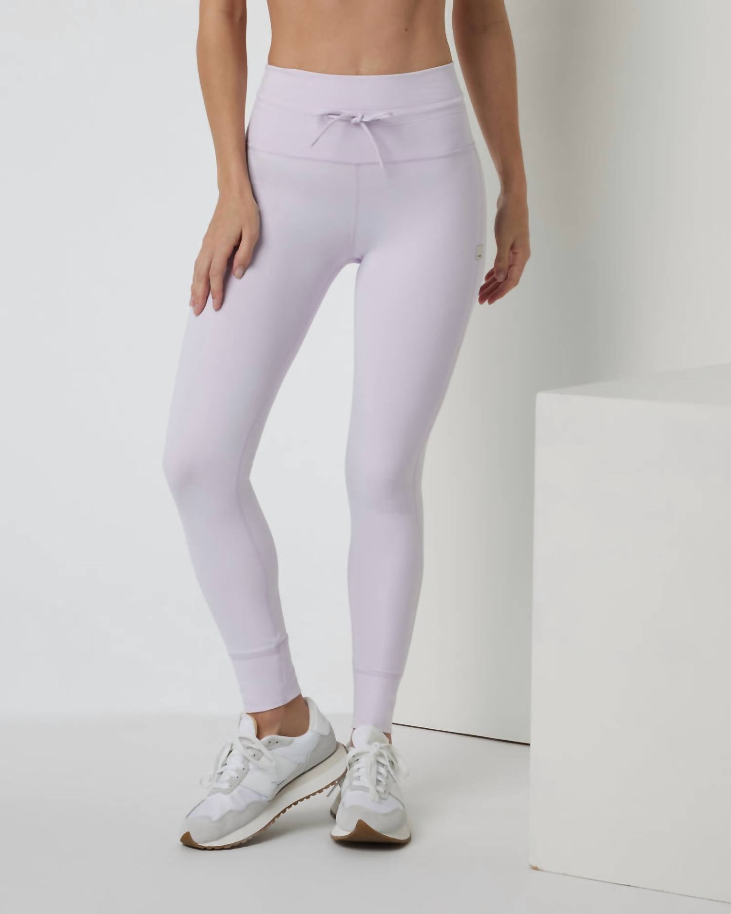 Discover the Vuori Daily Legging in Opal, a standout addition to your athleisure wardrobe. These leggings are crafted from 72% Polyester and 28% Elastane, featuring the peachy BreatheInterlock™ fabric with a high-rise waist for a no-slip fit. Designed with a 24.5" 7/8 inseam, they offer unmatched comfort and style with cuffed ankles and a pull-on closure. Care for these solid-colored leggings is simple with machine wash and tumble dry instructions, perfect for everyday fitness and workout occasions.
