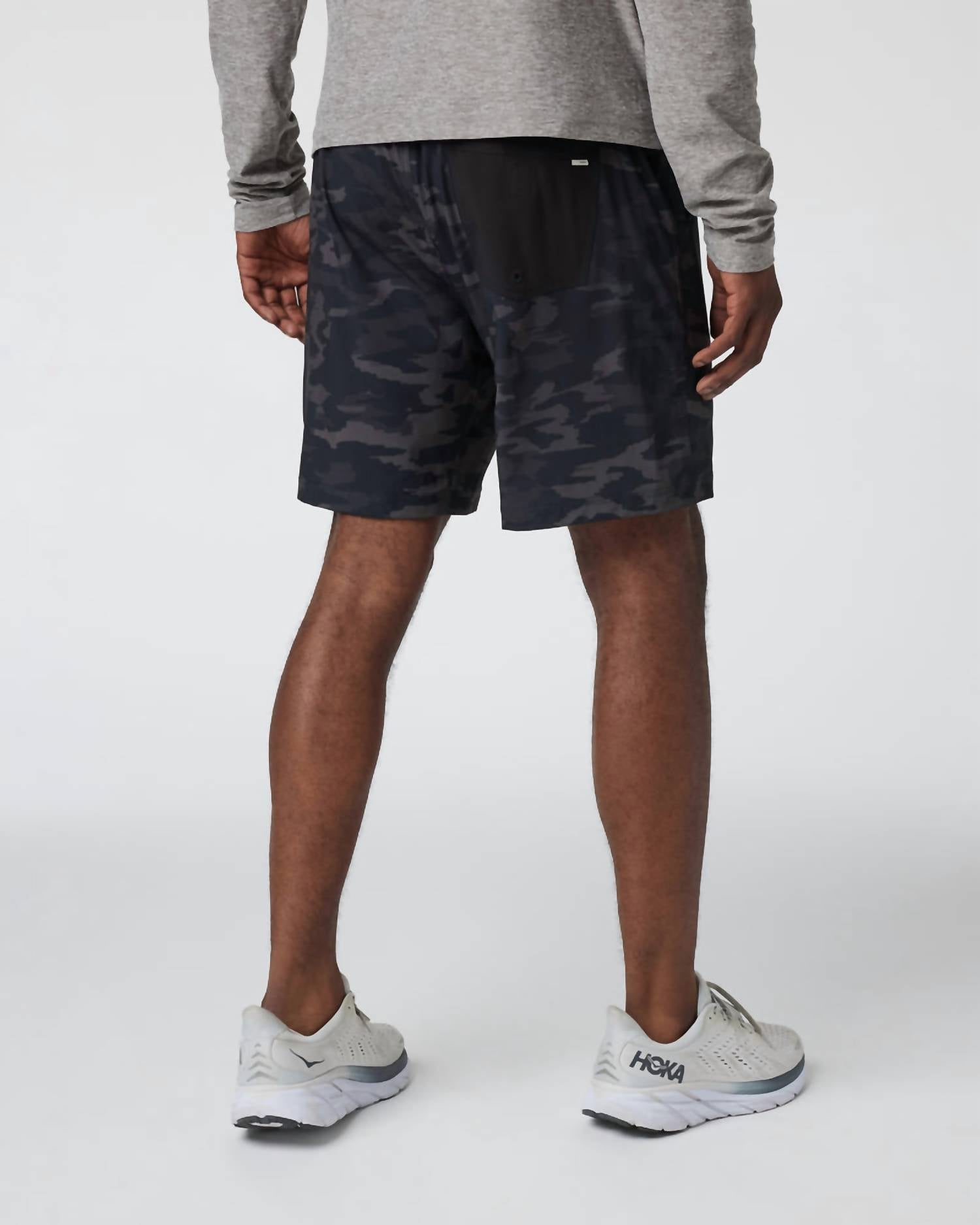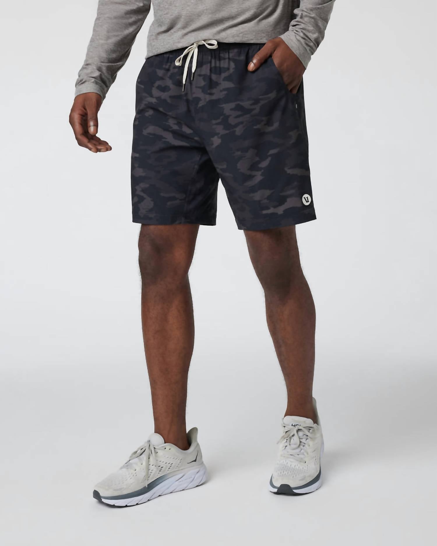 Introducing the Vuori Kore Short in Black Watercolor Camo, designed for excellence in any sport. These men's athletic shorts feature a classic athletic fit with an inseam of 7 inches and a versatile silhouette falling just above the knee. Crafted from breathable polyester with a convenient tie closure, these shorts include functional pockets and a comfortable boxer-brief liner. Care is easy with machine wash and tumble dry instructions, perfect for your summer athleisure wardrobe.
