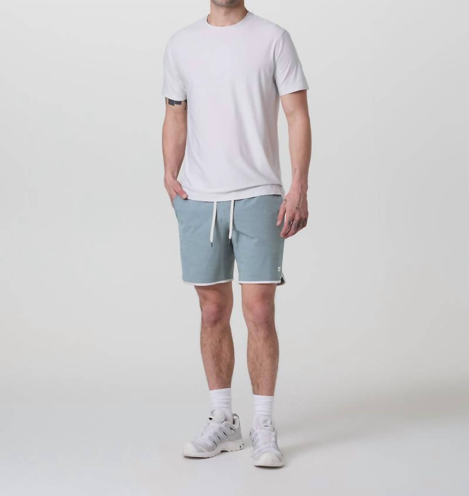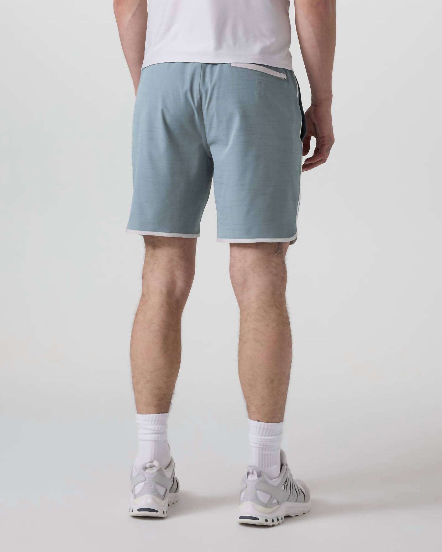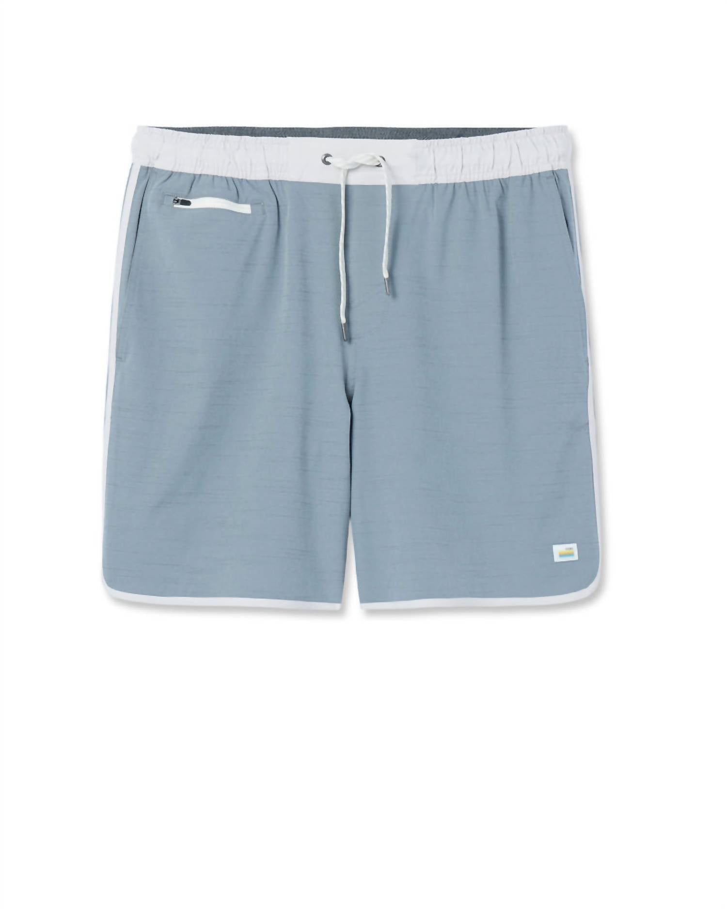 Introducing the Vuori Quick-drying Banks Short in Dusty Blue, the perfect choice for versatile athletic wear. Made from recycled materials, these low-rise board shorts feature a pull-on closure and a classic coverage ideal for swim and workout sessions. With a scalloped leg and quick-drying, 4-way stretch fabric, these shorts offer exceptional performance and comfort. Care instructions: Machine wash and tumble dry.