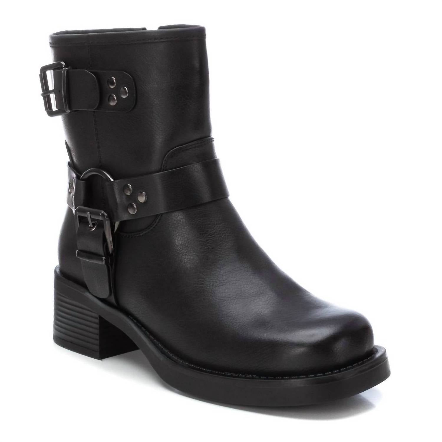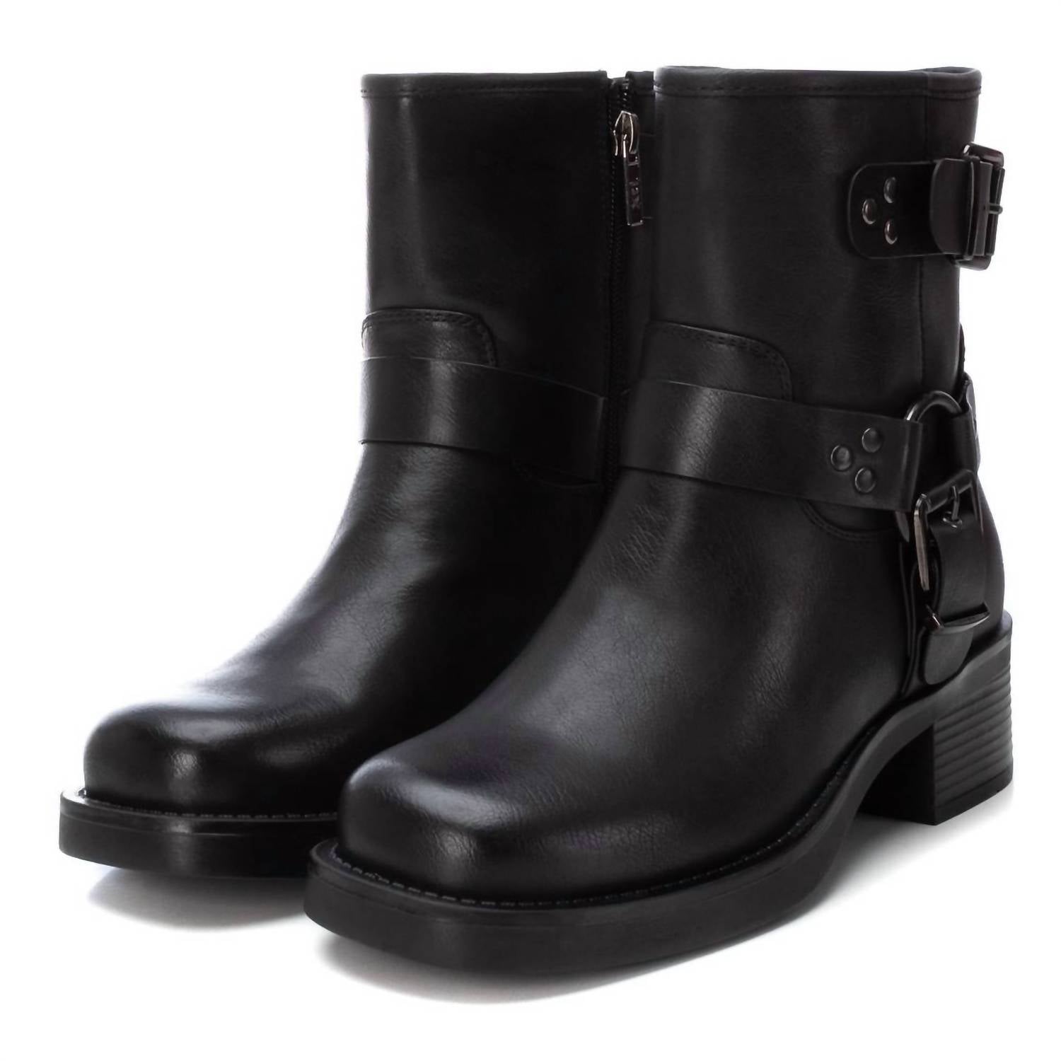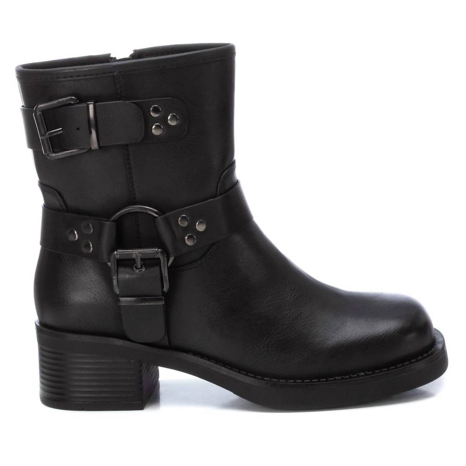 Step into style with the Women's Biker Booties by Xti, a chic addition to any wardrobe. Crafted from high-quality faux leather, these black ankle boots feature a side zipper closure for easy wear, complemented by decorative buckles and metallic details. The 1.5-inch block heel adds height without compromising comfort, supported by a lightweight, durable, non-slip rubber sole. Embrace the season's biker trend with confidence, knowing this vegan-certified model offers both breathability and a padded insole for ultimate comfort.