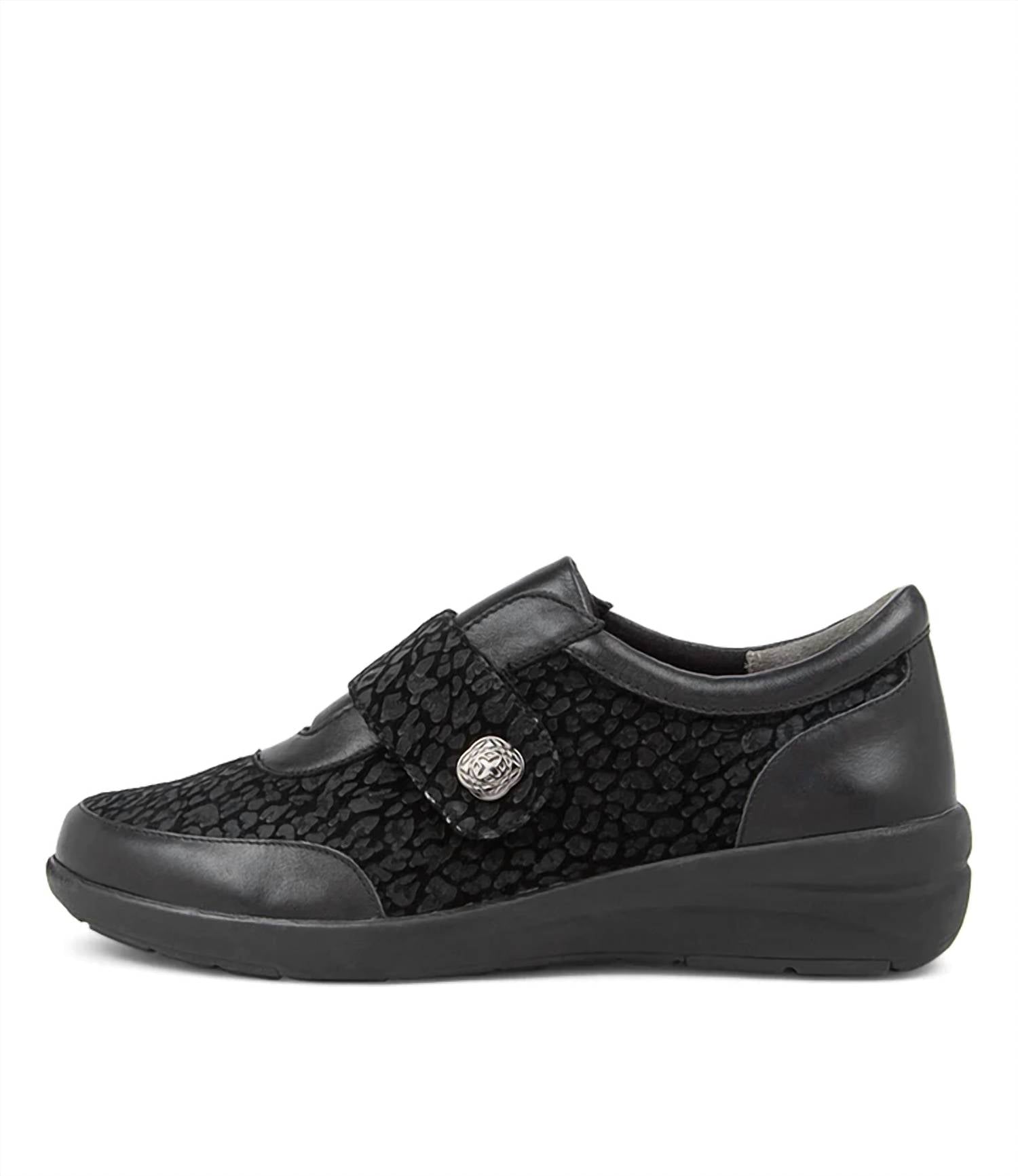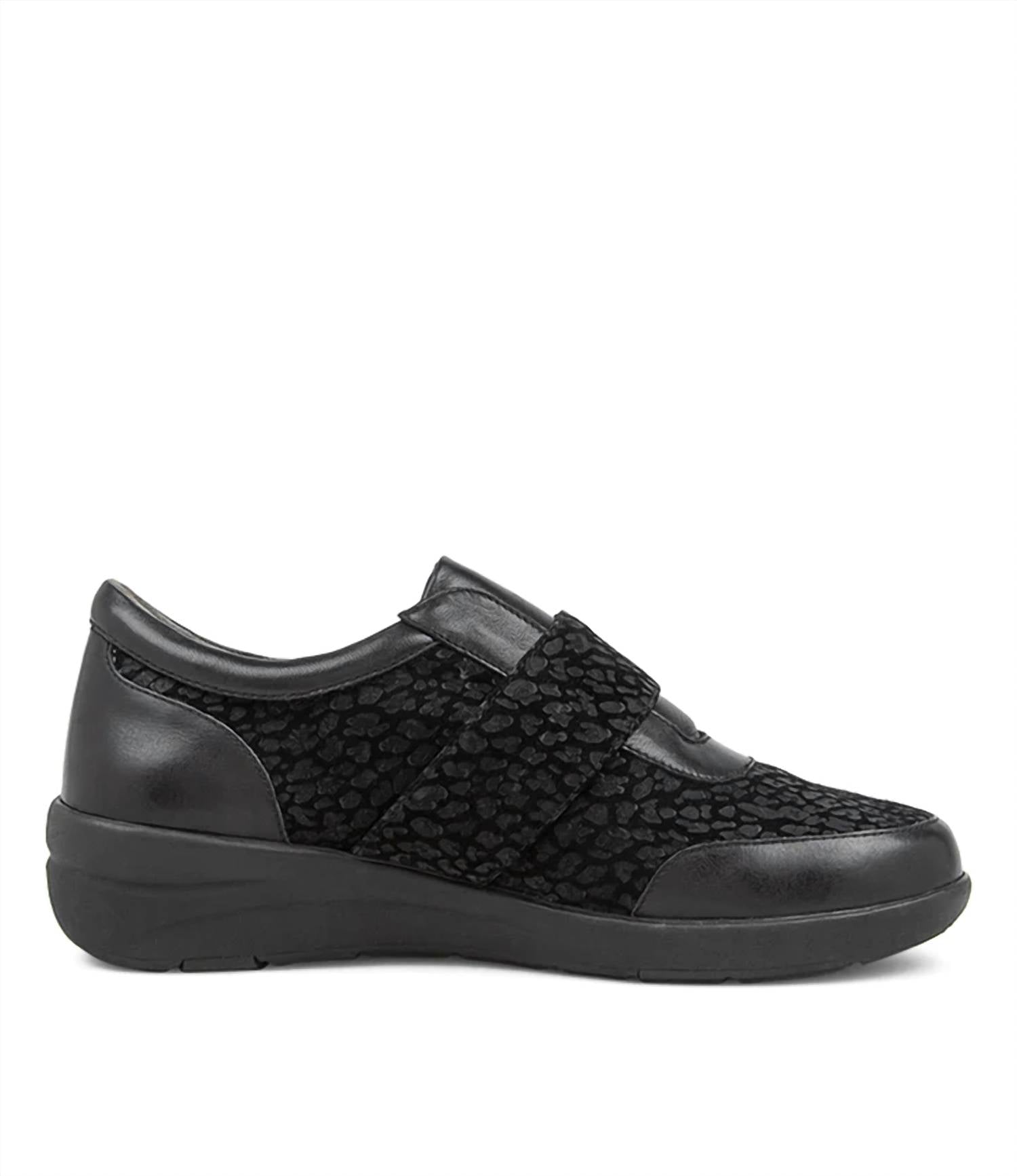 Experience superior comfort and style with the Nicky Leather Sneakers by Ziera, perfect for your back-to-school wardrobe. Crafted from premium leather, these sneakers feature a convenient riptape strap fastening and a platform heel with a height of 4.5 cm. Designed for all-day wear, they boast a wide fit with a removable active comfort footbed and shock-absorbing PU gel cushioning, while the sturdy rubberised EVA sole ensures lasting durability. Step confidently into the season with the sleek Black Leopard Multi sneakers, featuring a round toe silhouette ideal for all occasions.